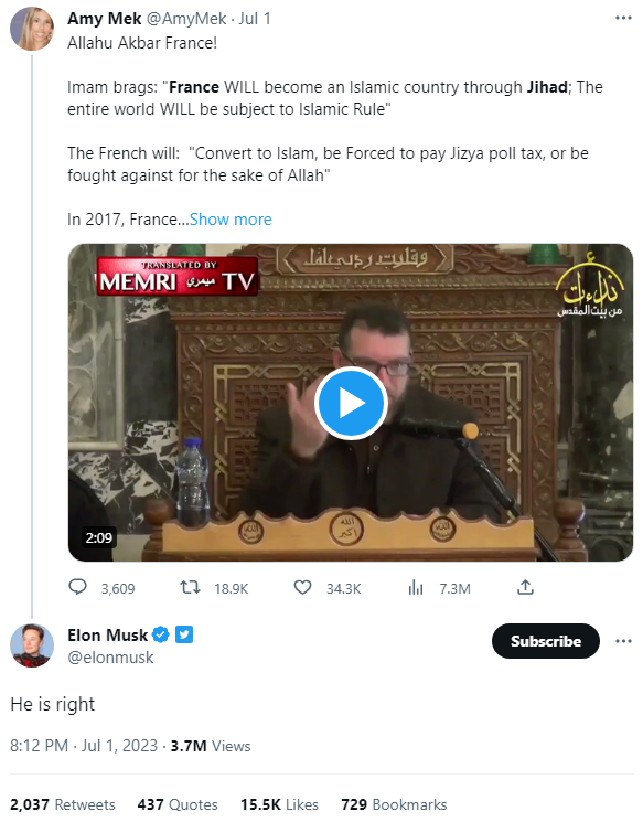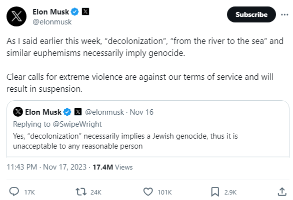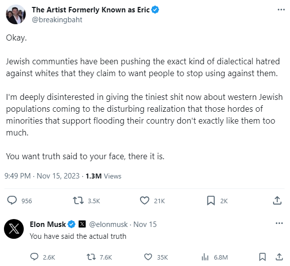 Elon Musk recently said a Nazi who said Jews own the West and are deliberately importing brown Muslims into it to destroy it was speaking the "actual truth". In response the ADL and corporations began a campaign to boycott Twitter. Musk responded by banning pro-Palestine slogans