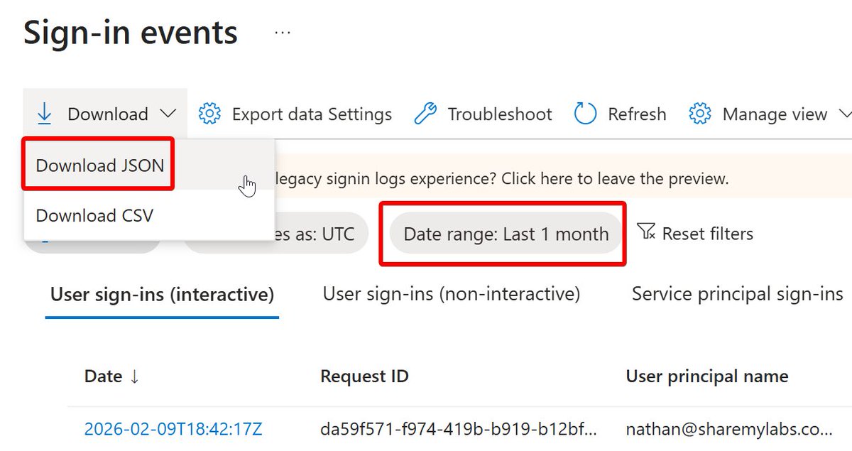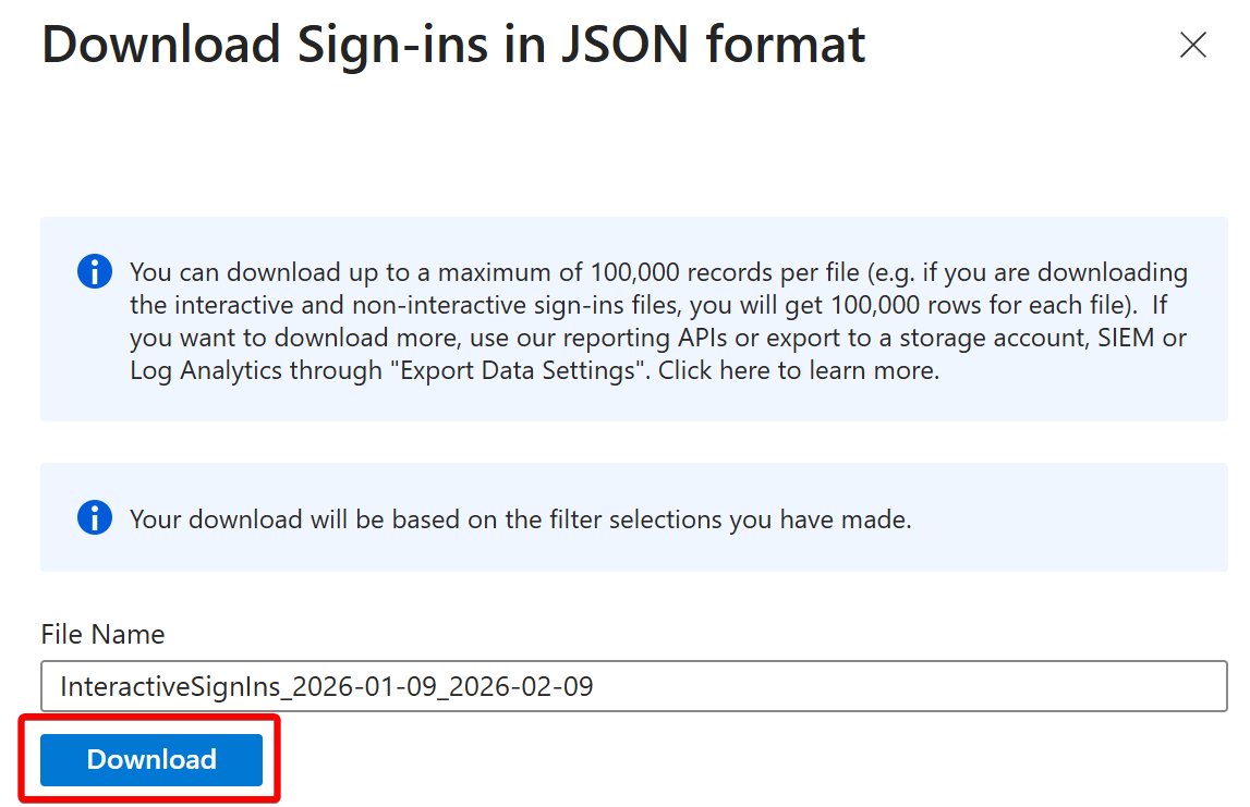 It's not as difficult as you might think! To get started, log into the Entra portal, go to Sign-in logs, set the date range to 1 month, then download the JSON: