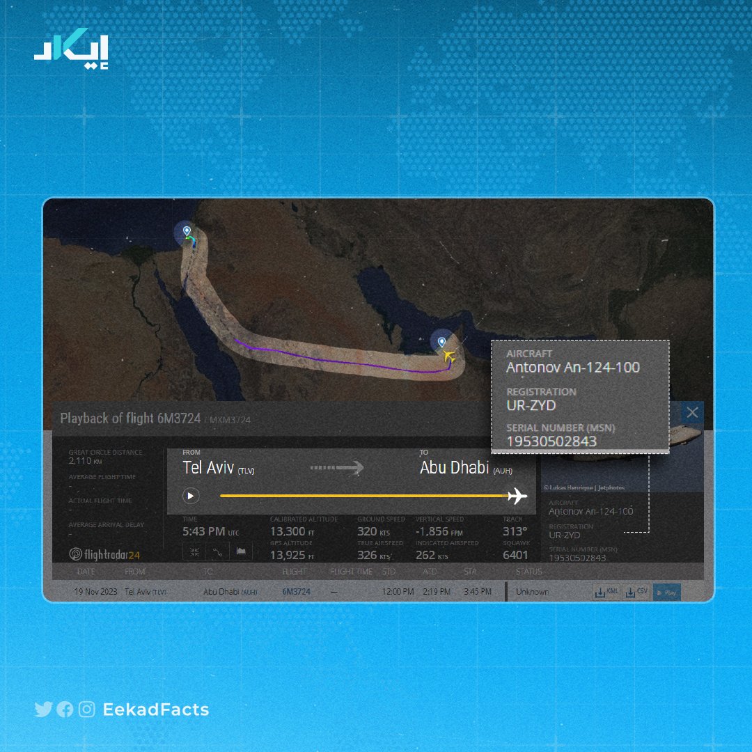🔻خلال متابعة فريق إيكاد لبيانات الملاحة الجوية على موقع "flightradar24"، رصدنا طائرة شحن جوي من طراز "Antonov An-124-100" ورقمها التسجيلي "UR-ZYD" خرجت من أبوظبي وحطت في مطار بن غريون الساعة 12:47 يوم السبت 19 نوفمبر.
