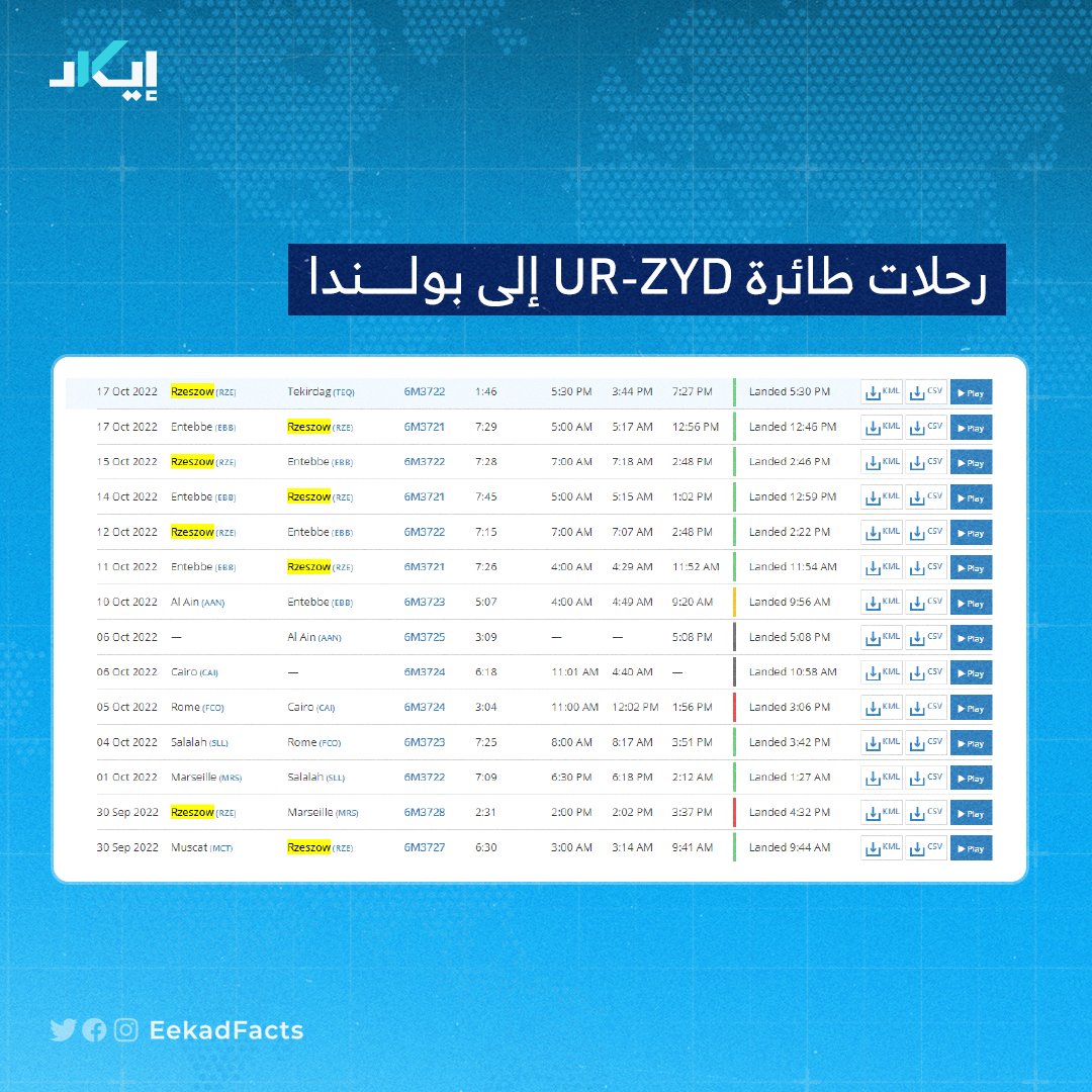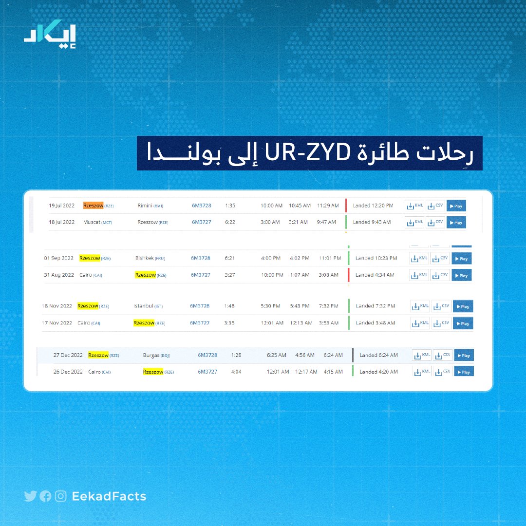 🔻سجل بيانات طائرة "UR-ZYD" أظهر رحلات خلال 2022 إلى مطار "Rzeszów-Jasionka" في بولندا.