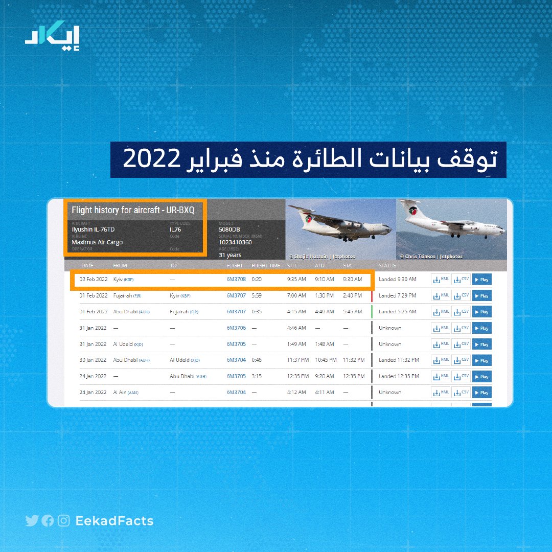 🔻لكن بيانات الطائرة متوقفة على "flightradar24" منذ 2 فبراير 2022 بعد رحلتها من كييف إلى وجهة غير معلومة.
