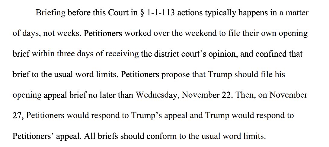 Petitioners also asked supreme court yesterday to reject Trump's request for extended briefing & to require his appellate brief to be filed tomorrow (!) with reply due Monday. Primary ballot must be certified by 1/4/24.