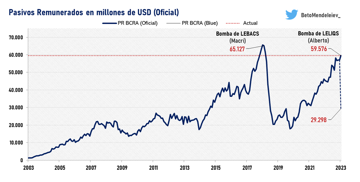 2) El stock actual de pasivos remunerados del BCRA representan 59.576 M de dólares (cotización al dólar oficial), más que las reservas internacionales que hoy se ubican en 41.500 M de dólares. En la famosa "bola de LEBACs" de Macri en 2018 llegó a 65.000 M de dólares, sin cepo.