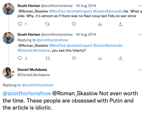 Scott Horton's defining characteristic is his hatred, in particular for liberals and libertarians. It leads him to tell people to go kill themselves, which earned him a twitter suspension at one point.