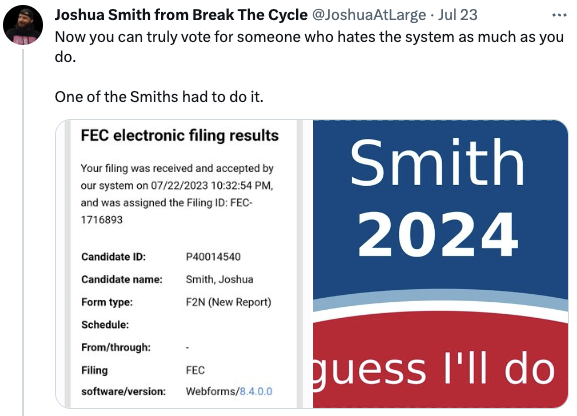 A few days ago Joshua Smith announced he's running for President, probably betting on the stupidity of the voters 🤡, referencing the undecisiveness to run of his fellow party Kremlintarian "Comic" Dave Smith.