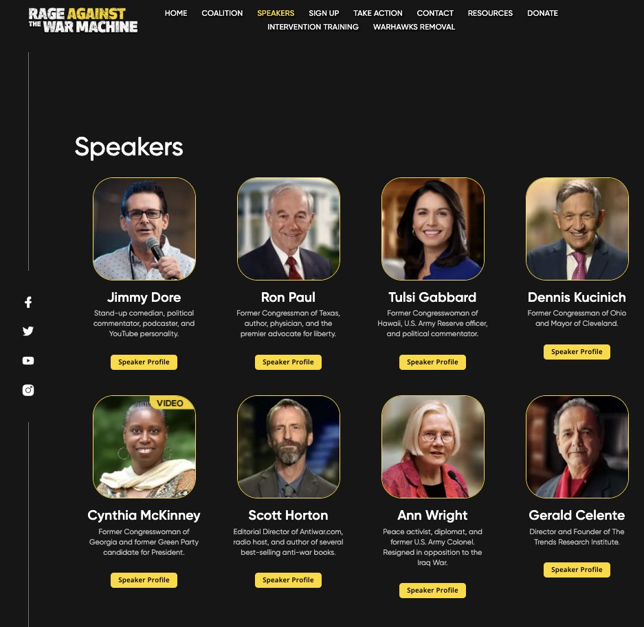 Ironically for such a person, he works for an "anti-war" website, speaks at "anti-war" rallies...