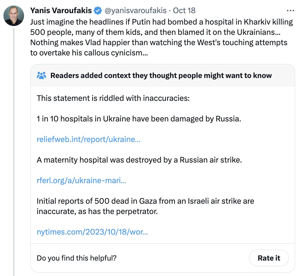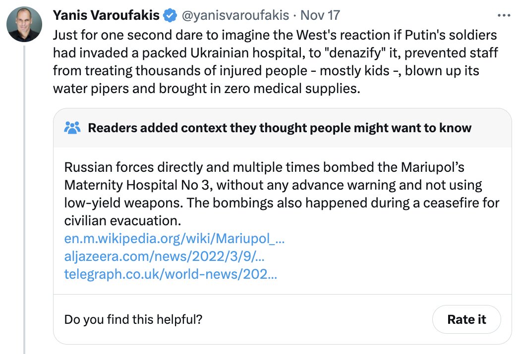 Yanis Varoufakis denying Putin's bombings of hospitals: