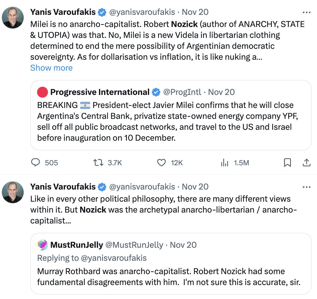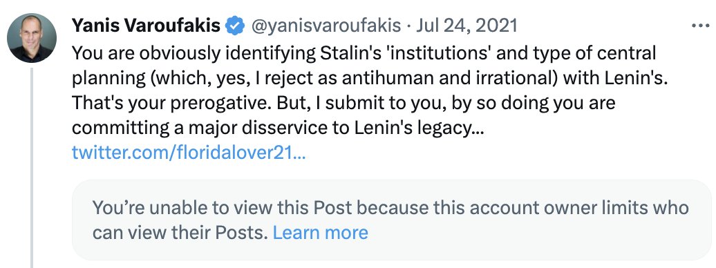 Varoufakis is, at best, an arrogant ignoramus who just can't admit being wrong and would rather double down, even when it's about a book he obviously didn't read past the first word of the title 😅
