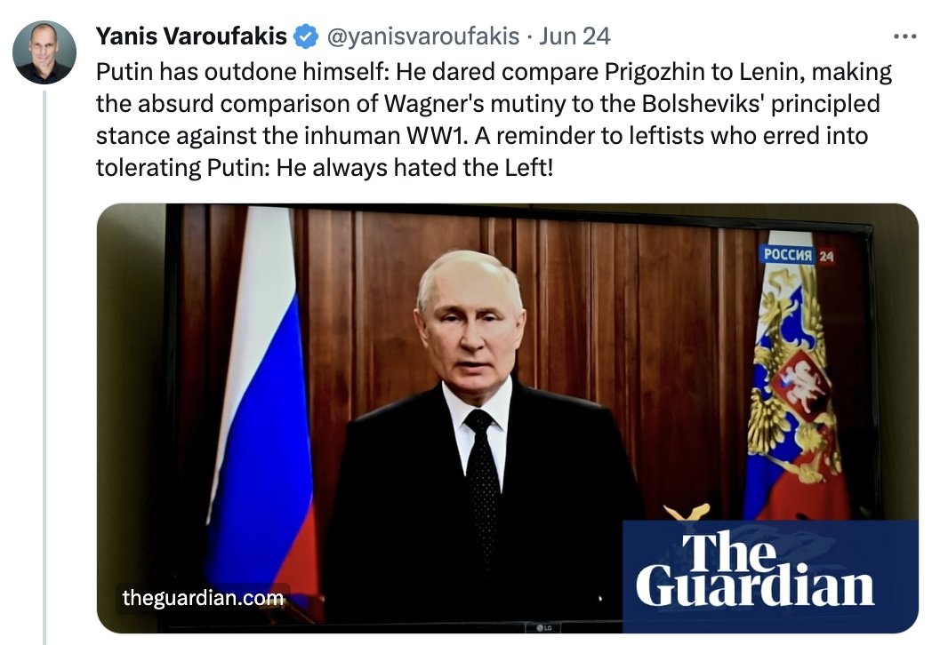 While denying Putin's war crimes, Varoufakis does have some issues with Putin: "This is the line for Yanis. Not the mass death, invasion, and imperialism of Putin’s maniacal kleptocracy, not the war crimes, no. How dare Vladimir compare his chef to Lenin."