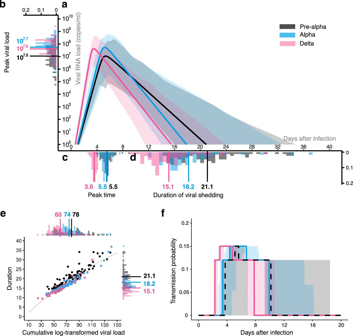 Researchers found that the SARS-CoV-2 variants that were most successful at spreading had an earlier and higher peak in viral load. However, as the virus evolved from the pre-Alpha to the Delta variants, it had a shorter duration of infection. 2/