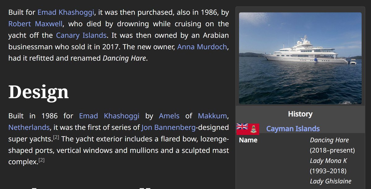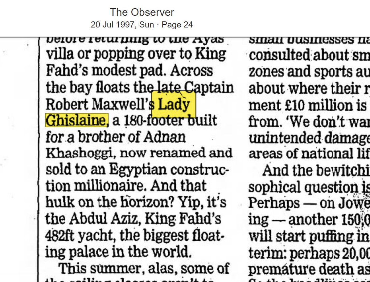 After Khashoggi abandoned the project, it was purchased by Robert, who named it after his daughter, Ghislaine Maxwell.