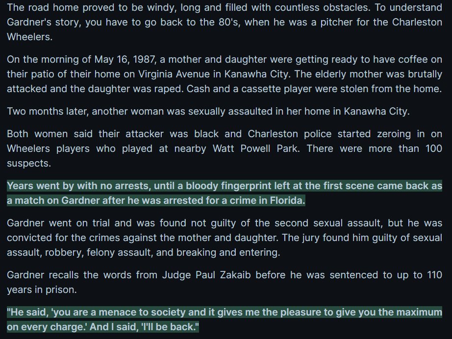 "At the time, Gardner was playing with the Charleston Wheelers in Charleston, West Virginia when a couple of sexual assault cases with two women surfaced. He was later charged with the crime along with robbery, burglary and assault during the commission of a felony."