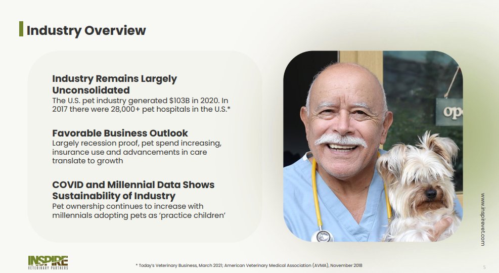 Inspire is an owner of general practice veterinary clinics in the United States. Inspire acquires practices, and, in many cases real estate, and then works with teams on a long-term basis to improve and maintain hospital operations, grow revenues and maximize earnings.