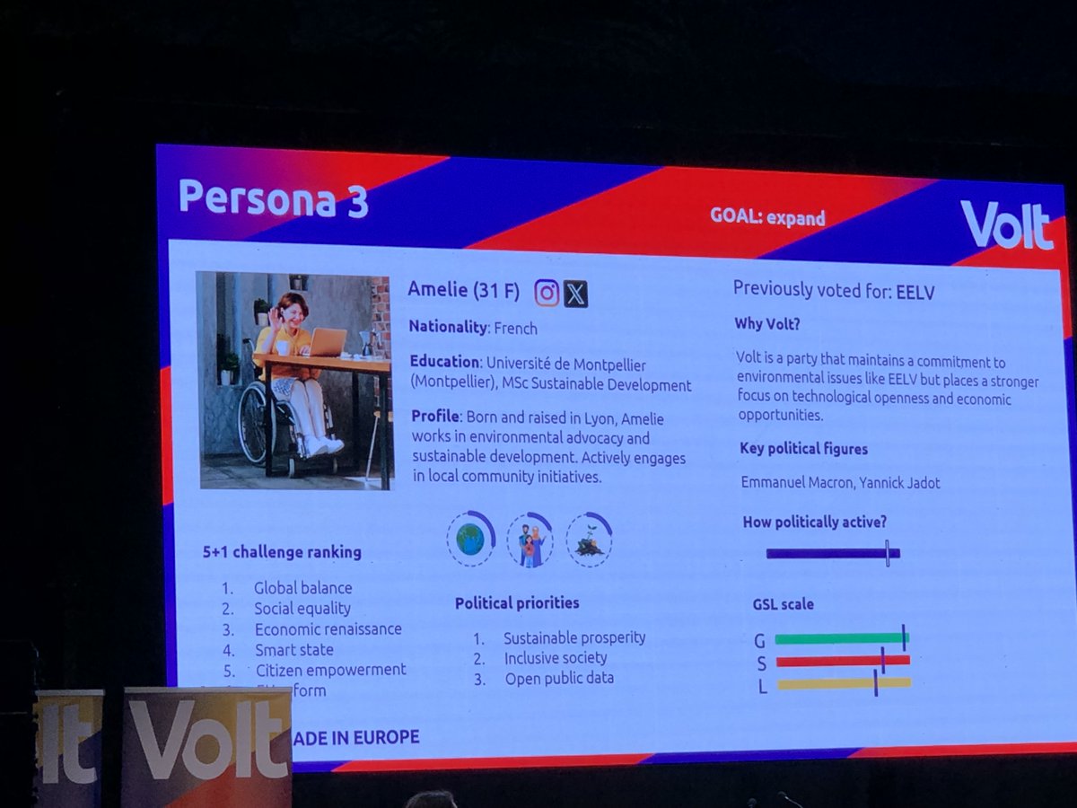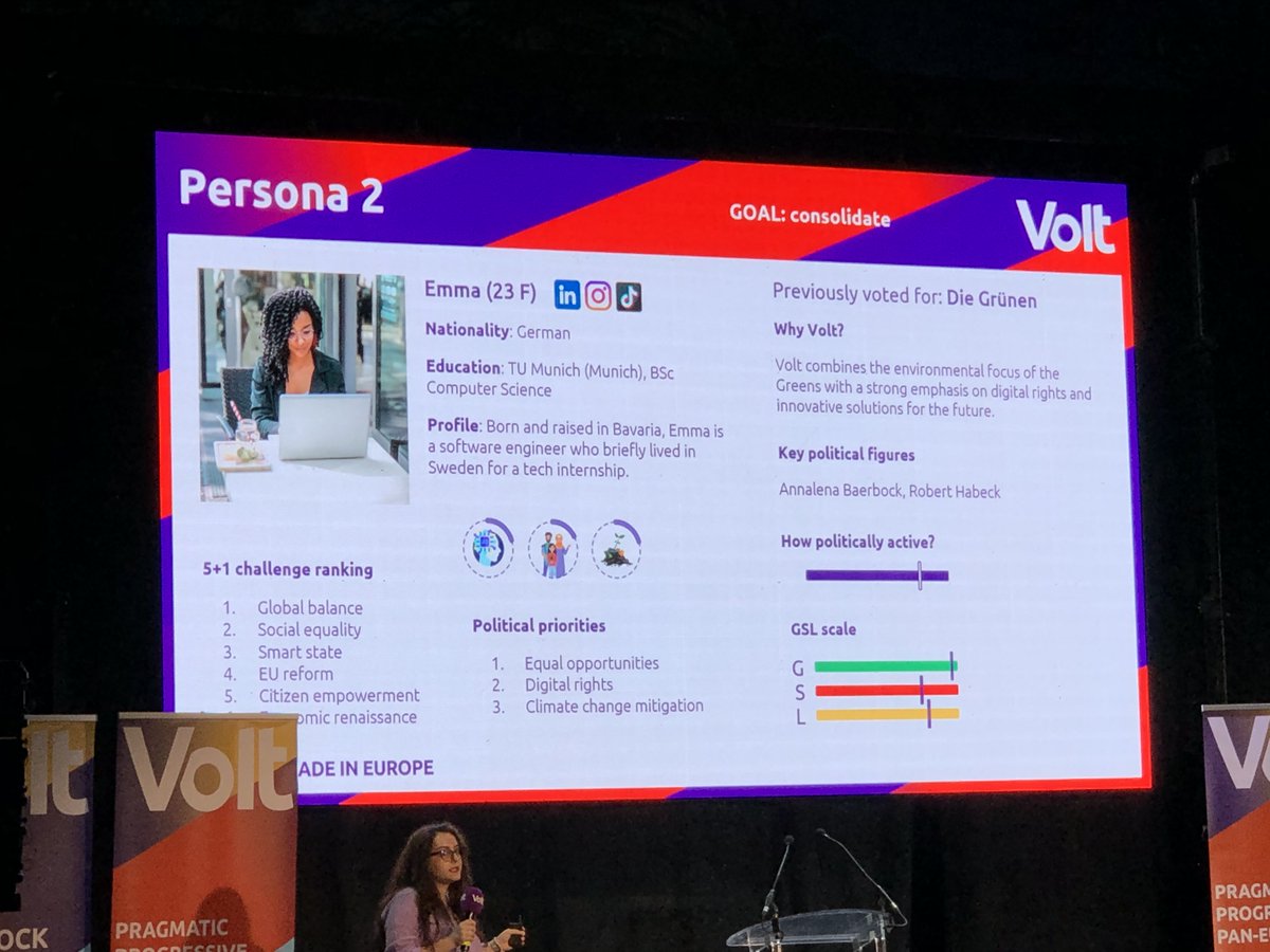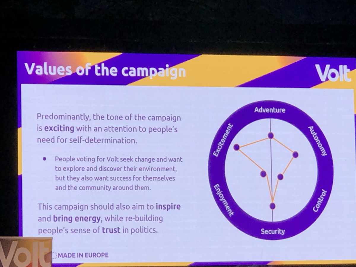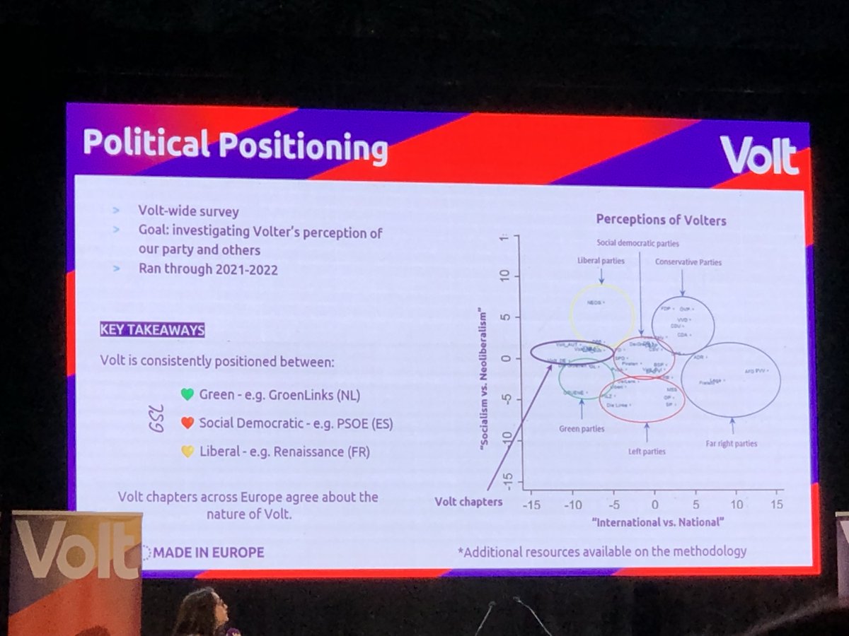 Nu de Europese campagnestrategie. Volt is een 'data-driven party' dus er is geanalyseerd 'door het data-team' wie de stemmers zijn. Er komt iets heel plats uit: Volt zit tussen groen, liberaal en sociaal-democratisch.