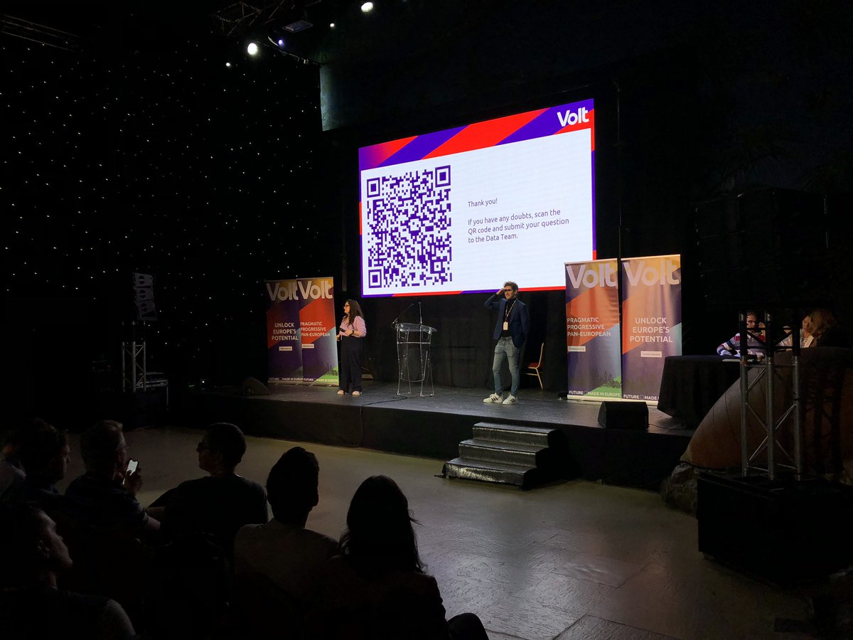 Ze gelooft erg in Volt en hoopt op goede energie, al is het Franse team nu wel erg moe nu het congres is georganiseerd. De mannelijke co-voorzitter leest nu iets op van zijn telefoon. Hij sprak nooit voor een zaal. Applausjes.