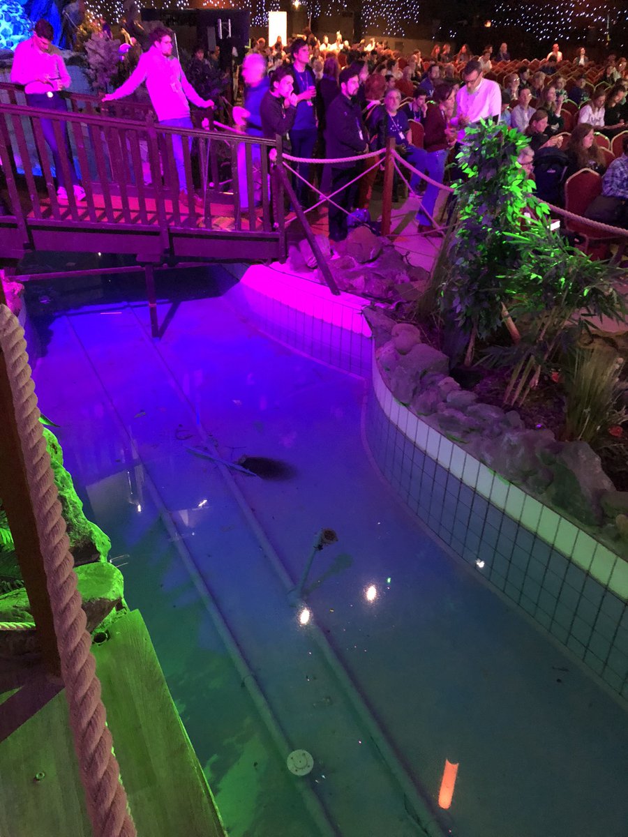 Nu zegt de man dat de energie loskomt door de doelen. Dat is duidelijk een grapje want men reageert niet zo enthousiast.
