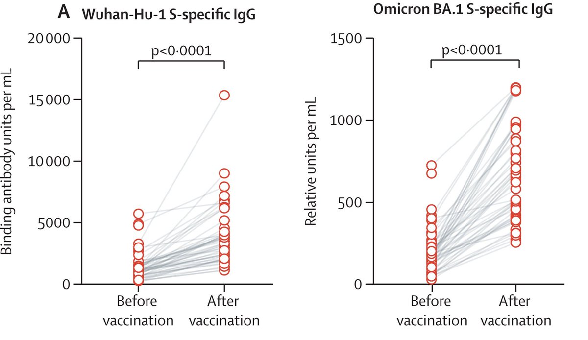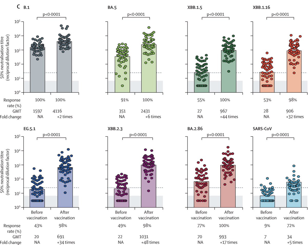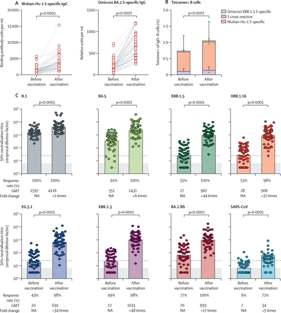 frühere und aktuelle #SARSCoV2-Linien aus, einschließlich EG.5.1 und BA.2.86. Insgesamt führte die #Omicron XBB.1.5-Impfung zu einem signifikanten Anstieg des Anti-S-IgG um das 2-9-fache und des Omicron Anti-S-IgG um das 3-6-fache (Abbildung A).