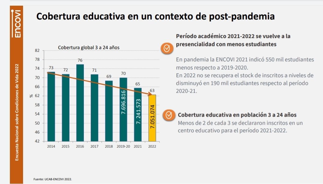 De todos los niños y jóvenes entre 3 y 24 años, solo el 63% está inscrito en algún plantel educativo, donde la mayoría recibe una educación precaria. Es relevante que sólo el 22% de jóvenes entre 18 y 24 años asiste a la Universidad. En el 2018 era 30%. Es decir bajó 😱.