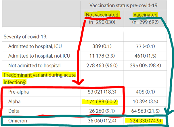Pour les vaccinés en revanche les auteurs ont sélectionné à quasi 80% ceux infectés par le variant Omicron, le variant du nouveau rhume qui fut bénin même pour les vaccinés 2-3 doses.