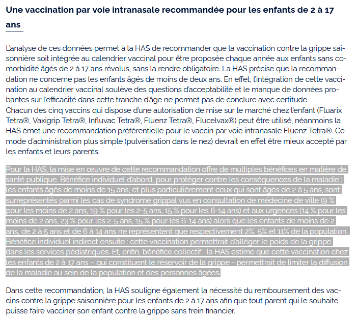 Dans sa recommandation, la HAS pointait la surreprésentation des moins de 15 ans parmi les passages aux urgences et les hospitalisations liées à la grippe.