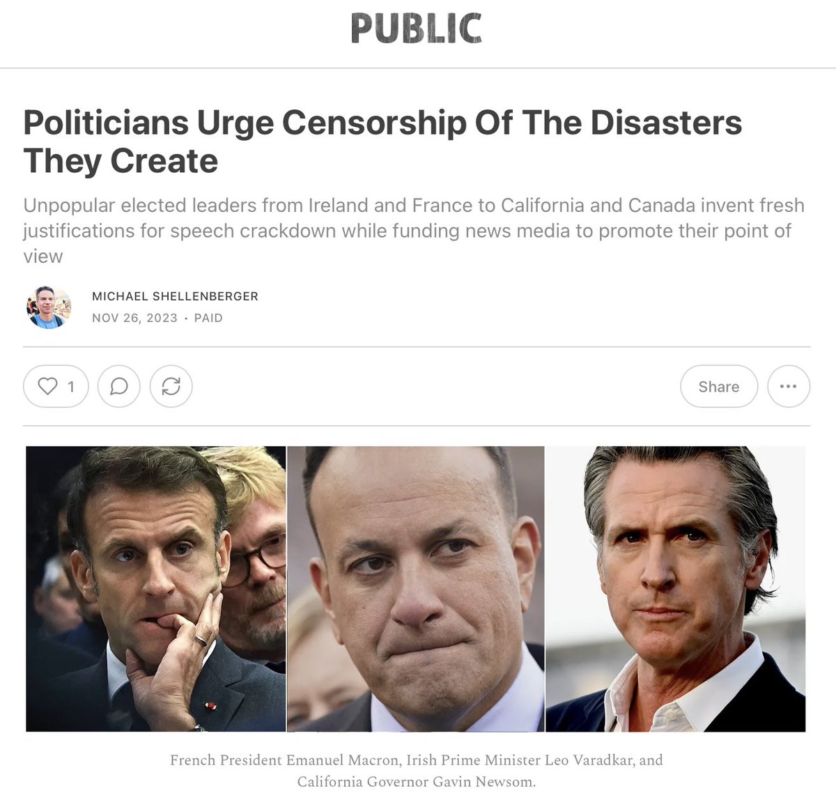 French President Emanuel Macron, Irish Prime Minister Leo Varadkar, and California Governor Gavin Newsom.