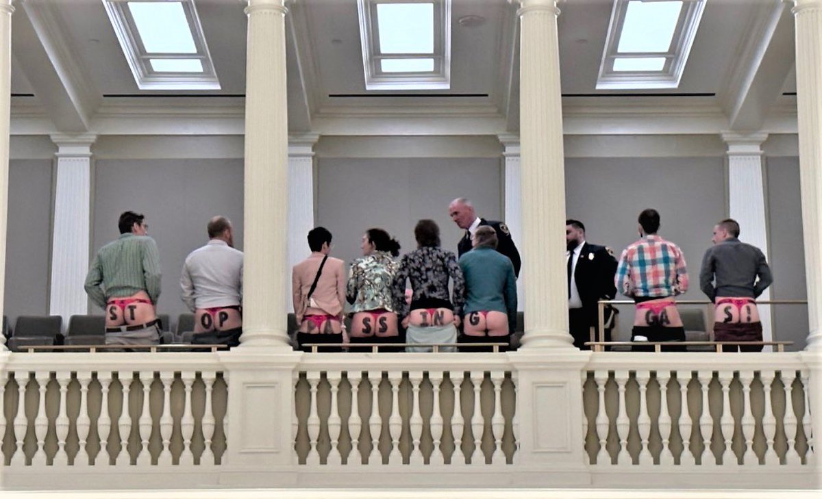 Climate protesters were arrested in thongs at the same State House. Their charges were quickly dismissed.