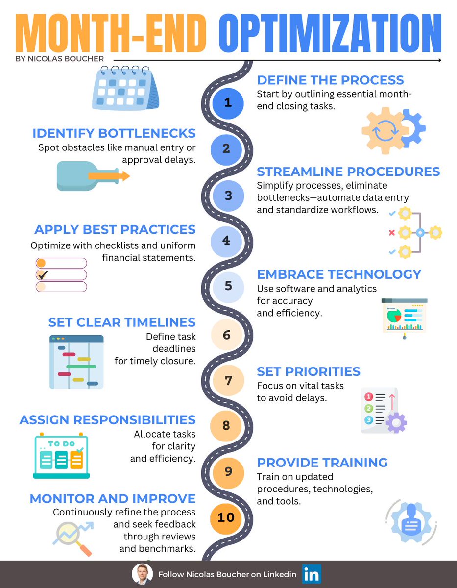 - Use KPIs to measure the effectiveness of the process (days of closing, length of process...)