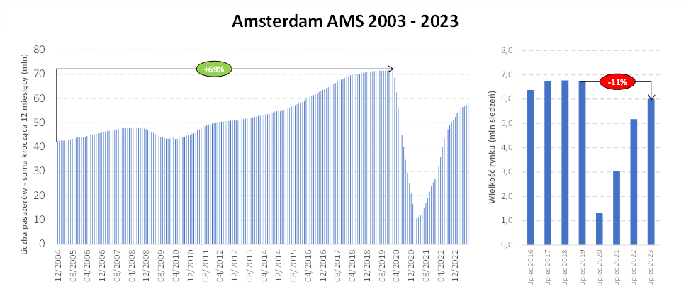 AMS w latach 2004 – 2019 wzrósł o 69%, z 42 do 72 mln pasażerów, średnio +2 mln rocznie