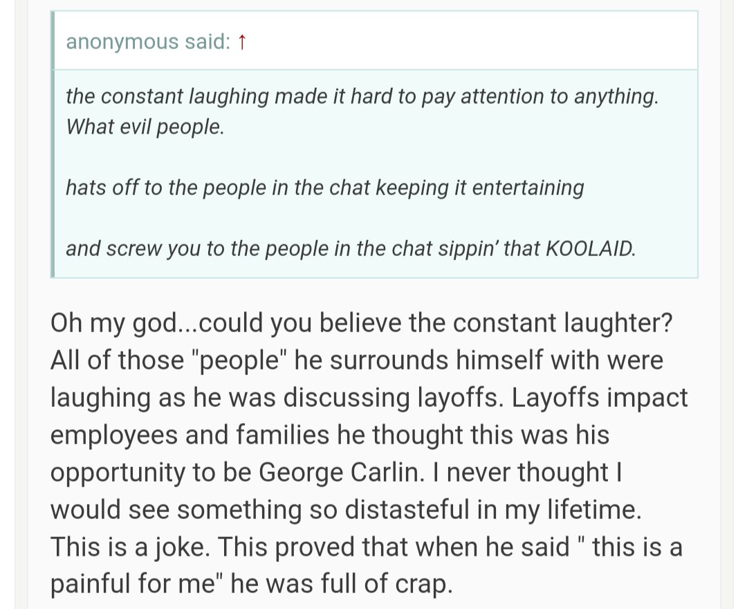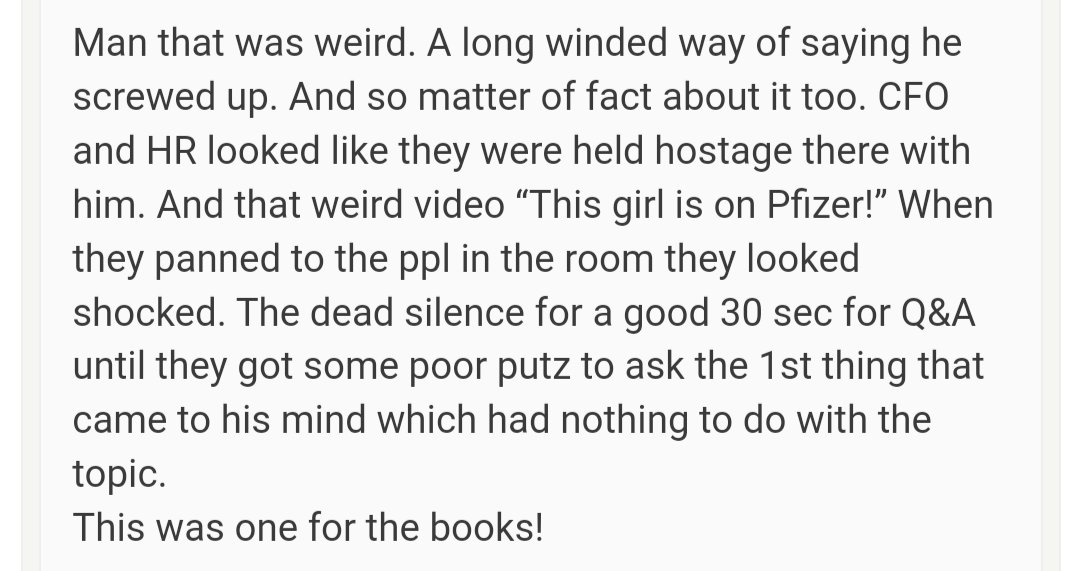 They had a internal global employees call today to discuss the cost cutting and ended with a motivational video "This girl is on Pfizer!" to shocked audiences ...