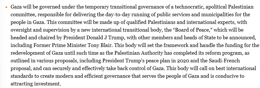 De volgorde is daarin verraderlijk: niet het 'apolitieke Palestijnse comité' wordt het hoogste orgaan, maar de 'Raad van Vrede' (Board of Peace).