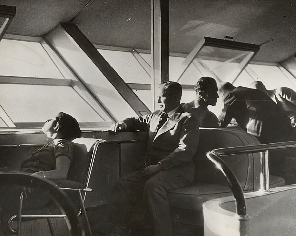 These luxury airships were called "hotels in the sky." You could leisurely float ~500-1000ft above the ocean in your transoceanic journey. Here is an excerpt from the Hindenburg brochure: