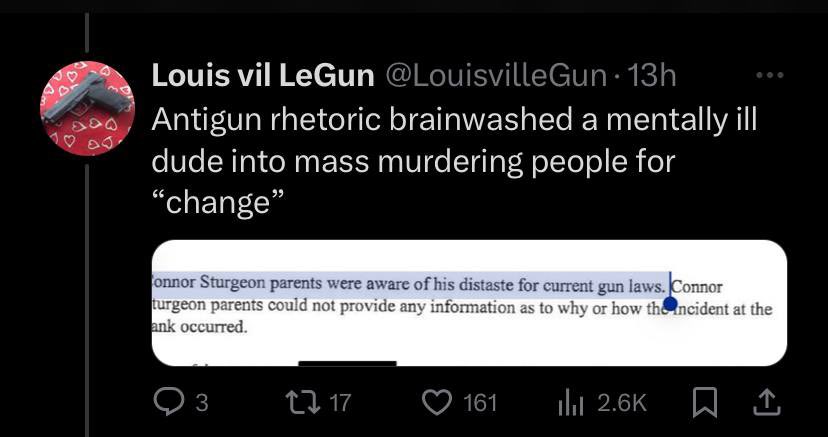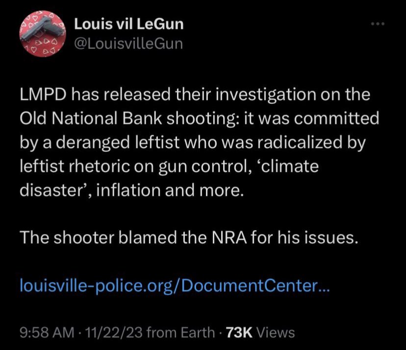 @MomsDemand @shannonrwatts @GIFFORDS_org @GabbyGiffords @Everytown are directly responsible through their propaganda for the murder of 5 people in Louisville Kentucky.