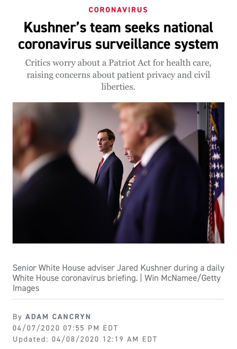 Jared Kushner is close friends with Vivek (they dine together at Trump’s golf clubs) and as senior adviser to Trump, Kushner pushed a national coronavirus surveillance system *around the same time* that Vivek said he was was talking to policymakers about it.