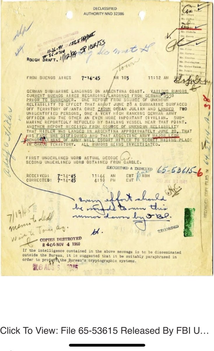 In addition to Argentina, the SS also fled to the U.S.A via Operation Paperclip and formed NASA. SS also escaped to other countries around the world including Antarctic underground Nazi military bases as seen below. vault.fbi.gov/adolf-hitler/a…