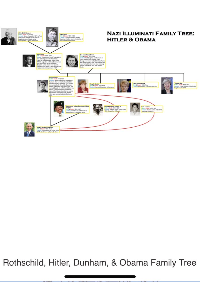 The following family tree demonstrates how Hitler was secretly a Rothschild descendent and therefore is also part Jewish (Ashkenazi Khazarian Zionist). Meaning that Barack Obama is also a Rothschild descendent and also part Jewish. Rothschild, Hitler, Dunham, & Obama Family Tree