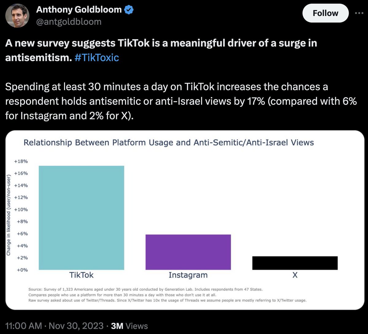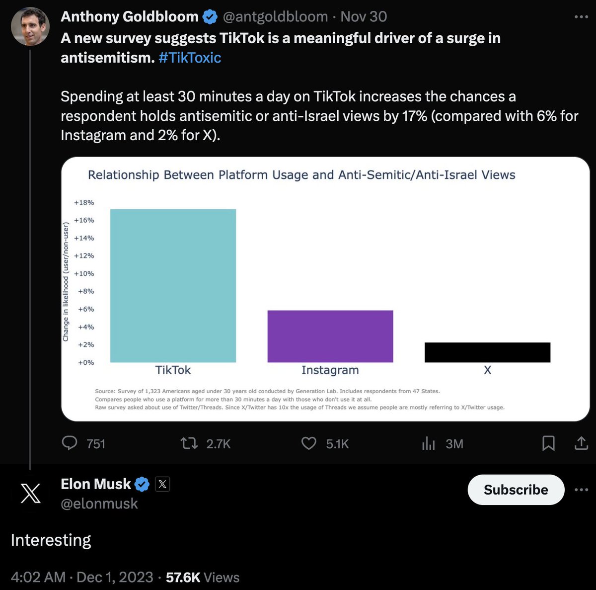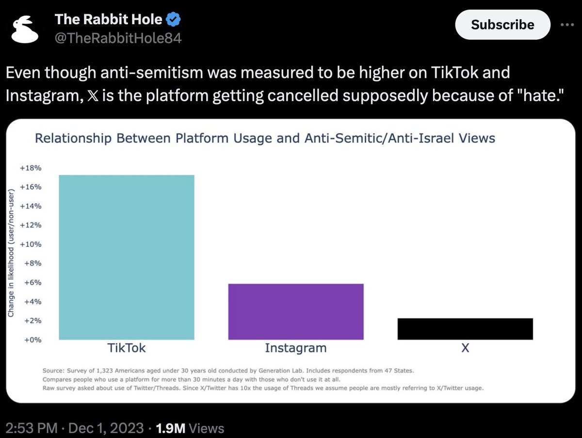 Even though anti-semitism was measured to be higher on TikTok and Instagram, 𝕏 is the platform getting cancelled supposedly because of "hate."