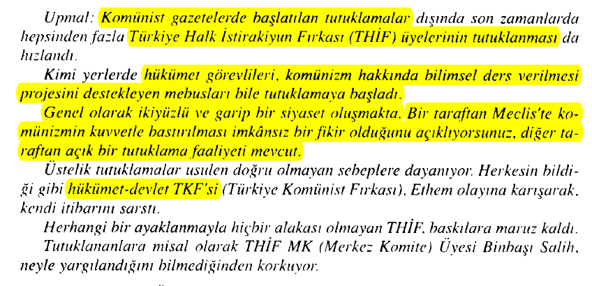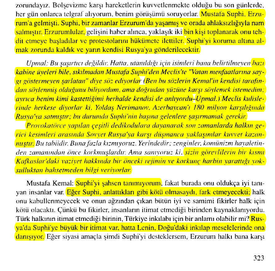 Bak ağzı bozuk zırcahil, referansta bulunduğun Sovyet elçisi Upmal, Kemal'in ve Kemalistlerin nasıl gözlerini kırpmadan yalan söylediklerini, provokasyon yaptıklarını ve komünistleri ajanlaştırmaya çalıştıklarını Kemal'le yaptığı görüşme zaptına düştüğü notlarda bizzat yazıyor: +