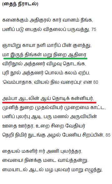 In Paripadal 11, the poet Nallanthuvanar talks about the Athirai star (green underline - Arudra Darisanam of the month of Margazhi) and women performing the Amba Aadal (red underline). +