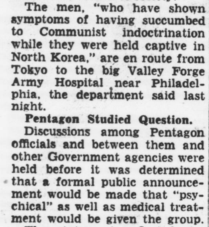 "White" prisoners had resisted indoctrination. Gray prisoners had cooperated minimally, but the hard-core collaborators, the "black" thought to be security risks, were isolated and flown to Valley Forge Hospital.
