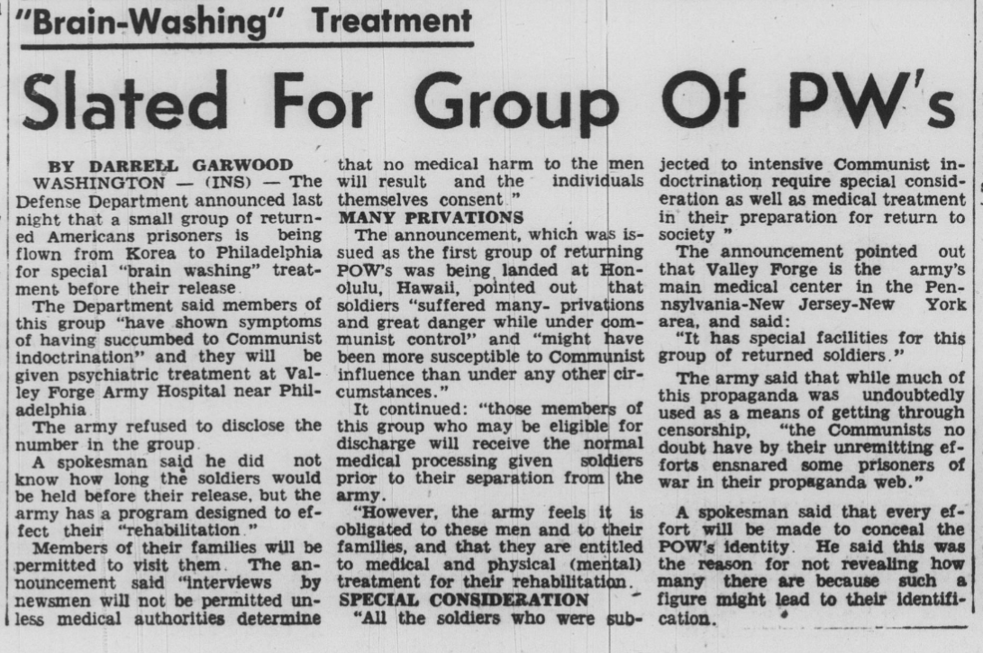 On April 29th 1953, American POW's began arriving in the United States from Tokyo, as part of an exchange program with the Communists called Little Switch. The returning POWs were carefully vetted and assigned one of three categories—black, white, or gray.