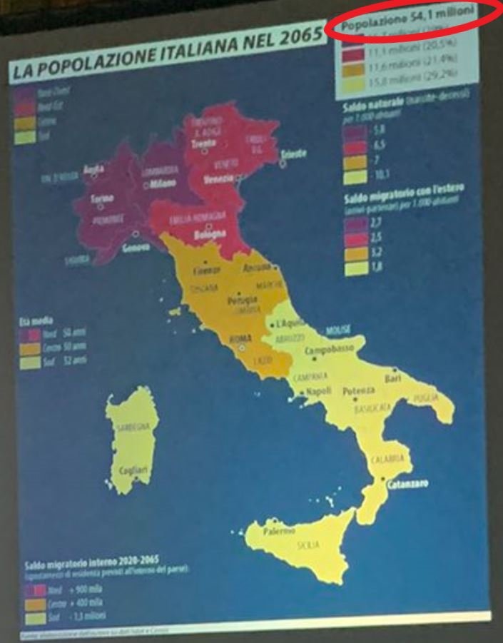 Nell'anno 2065 in Italia ci saranno 54,1 milioni di persone? Solo con scenari molto positivi o con dei cambiamenti epocali nel Paese. Il dato della mappa, presentata da @Rossagnese_ al festival di Limes, probabilmente si basa sulle proiezioni dell'ISTAT che cercano di