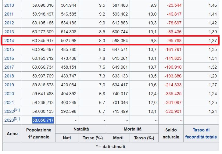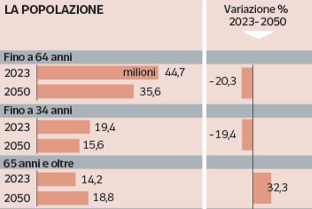 alle previsioni. Avendo toccato il picco della popolazione nel 2014, da allora in 9 anni abbiamo perso quasi 1,5 milioni di persone. Con questo trend in corso, se rimane costante, caleremo nei prossimi 41 anni di circa 6,8 milioni di persone e nel 2065 saremo circa