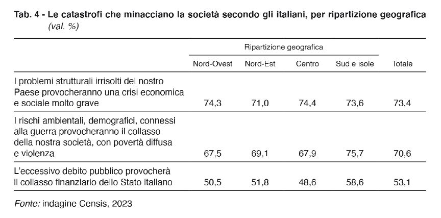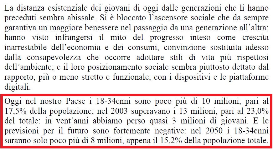 vuoto, consapevoli del declino sistemico dell'Italia (stando al campione, ben l'80,1% degli intervistati). Un declino per prima cosa demografico, dove in 20 anni sono scomparsi 3 milioni di giovani con un invecchiamento netto della popolazione. Nei prossimi anni gli