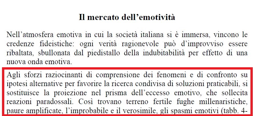 specialmente quelli con titoli di studio elevati che non si vedono minimamente valorizzati (perdita netta di menti con competenze, nuove idee, vitalità, dopo aver speso anni per formarle...). Come reagisce la popolazione nel declino? Con un eccesso di emotività, pompata in