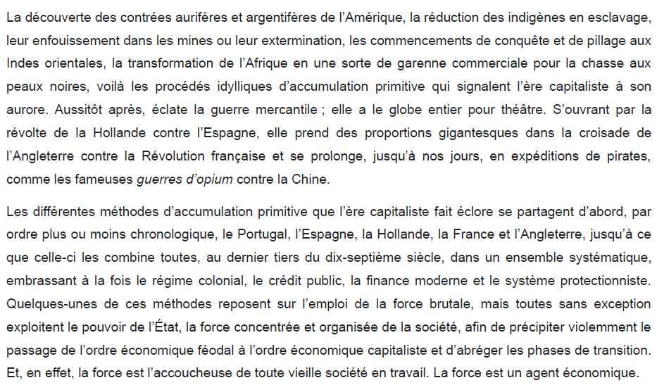 des opportunités bien plus grandes, normalement, que celles des activités d’exportation orientées vers des échanges pacifiques avec les membres des autres communautés politiques.» Ces mots rappellent fortement l’analyse que fait Marx de l’accumulation primitive du capital. 6/25
