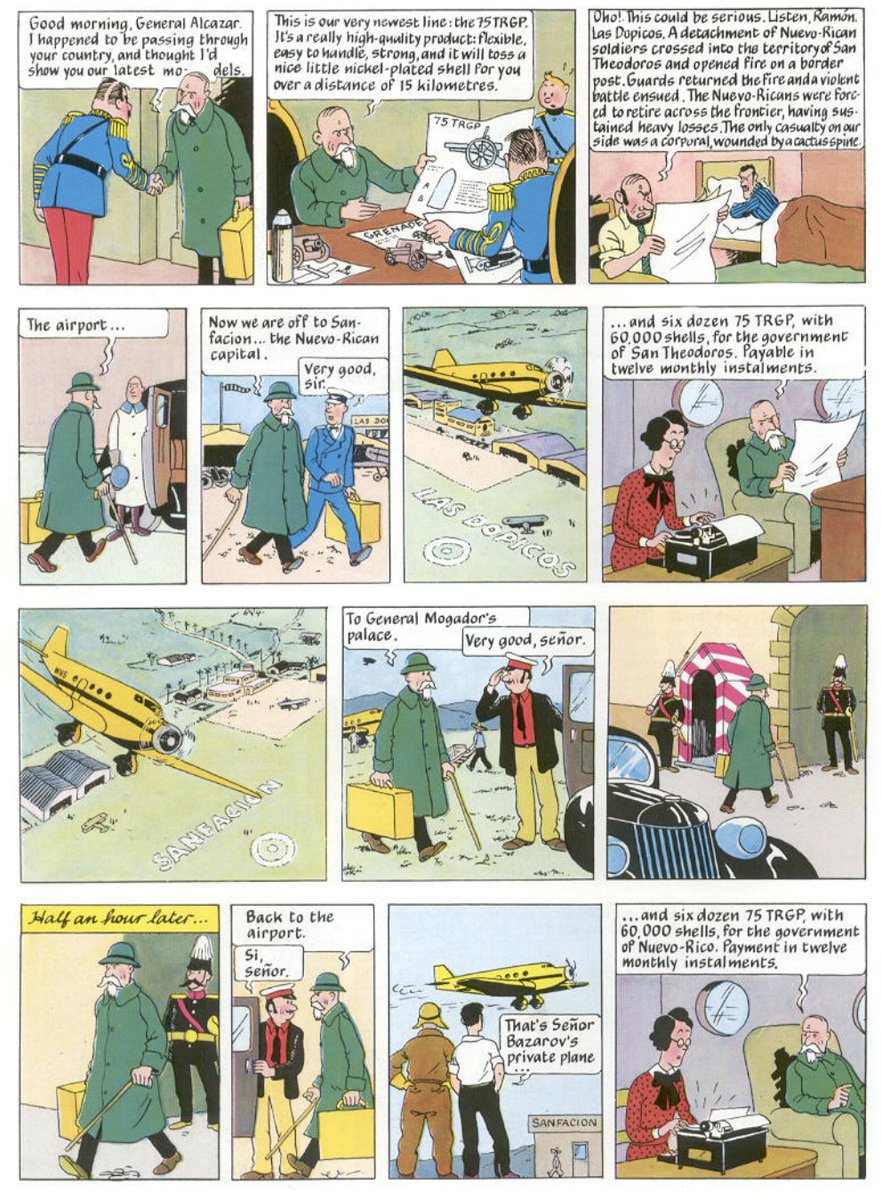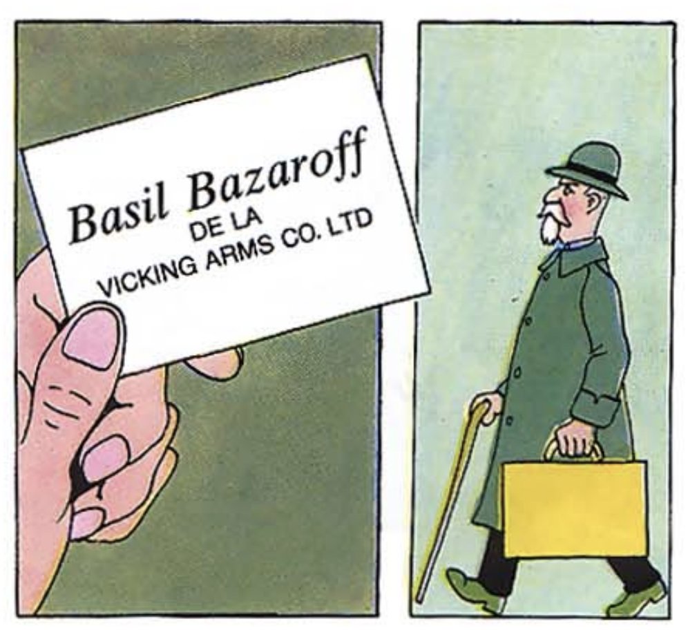 In the Tintin comic, Basil Zaharoff and Vickers-Armstrongs are satirised as Basil Bazarov and the fictional Vicking Arms Co. Limited, engaging in the “Systeme Zaharoff” tactic—funding both sides in the war. The connection was quite clear.