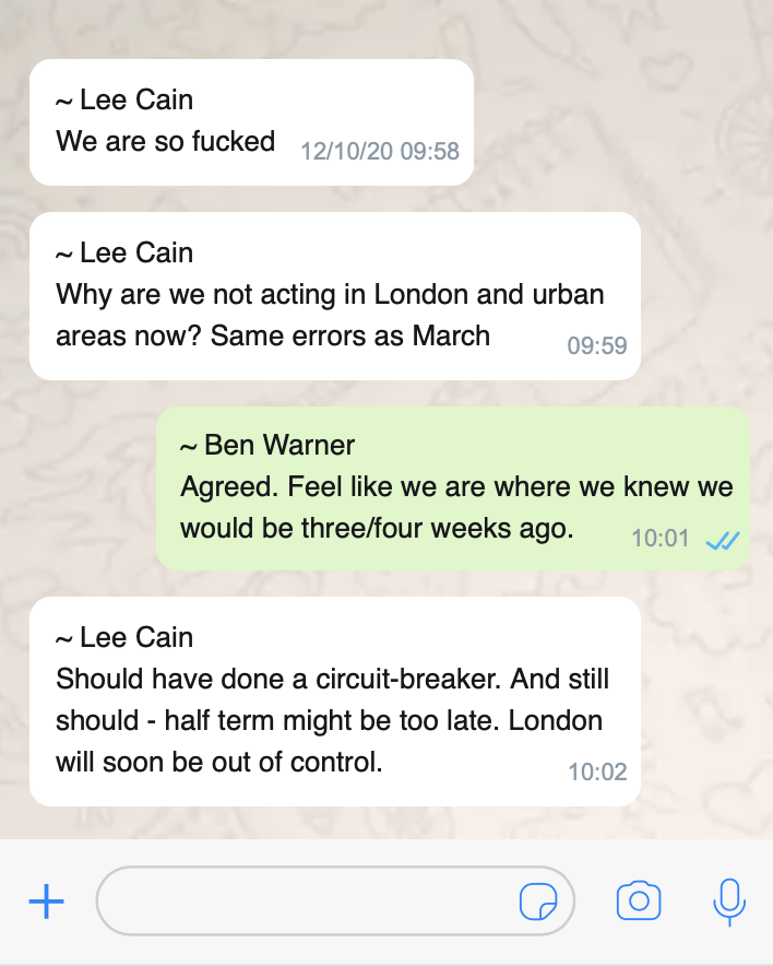 The same day tiers are announced, Downing Street aides Ben Warner and Lee Cain are WhatsApping each other. “We are so fucked”, says Cain. “Same errors as March.” Ben Warner agrees. “Feels like we are where we knew we would be three/four weeks ago.” (my graphic)