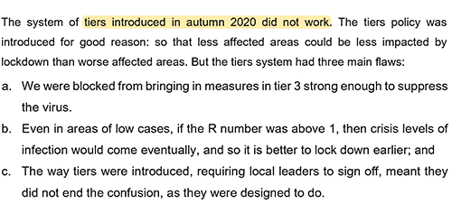 Matt Hancock in his witness statement is pretty clear on tiers: “The system of tiers… did not work”. Gives three reasons: top tier too weak; even in low prevalence areas R > 1; and local leaders argued against being placed in higher tiers which delayed everything.