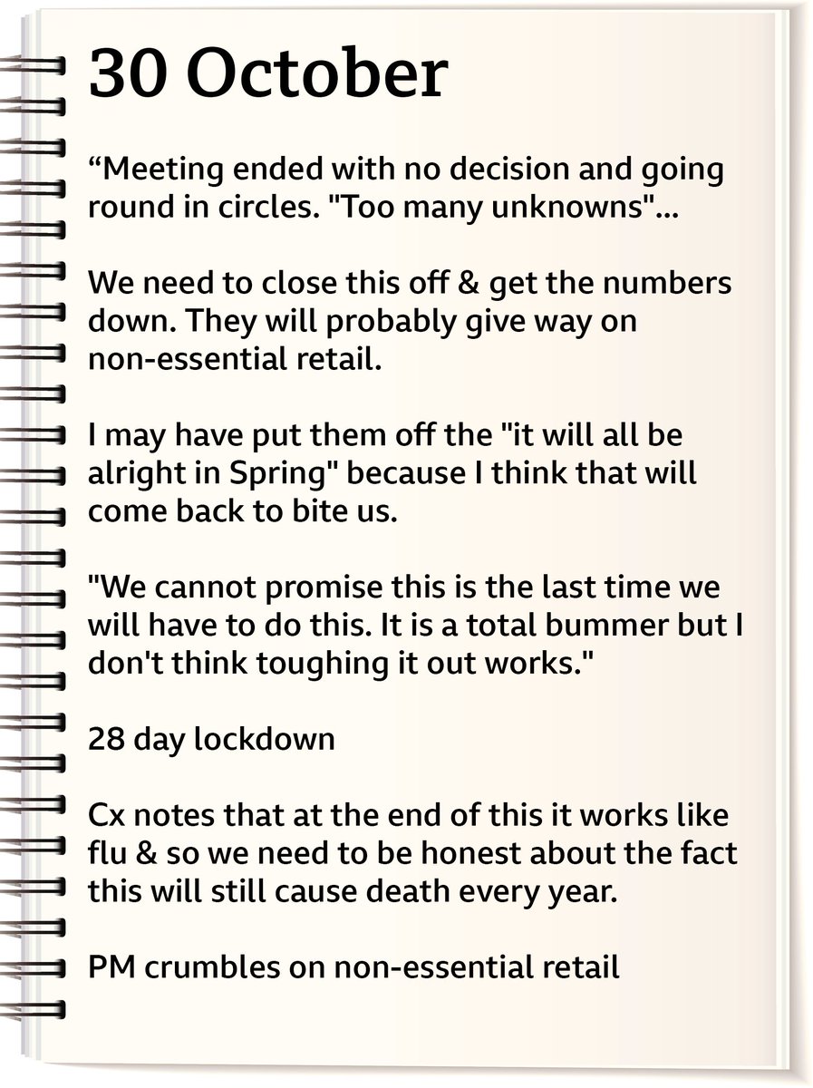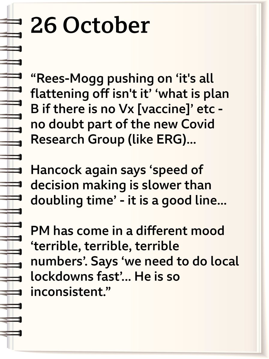 Vallance is well aware of the press in his diary entries. In one he says: “Papers now saying why aren’t we doing more”. @piersmorgan gets a mention for how he now apparently supports tougher measures when on 21 Sept he was "fuming" about how wrong Whitty and Vallance were.
