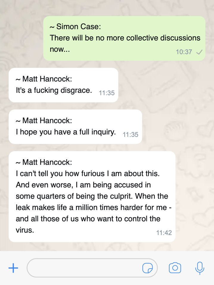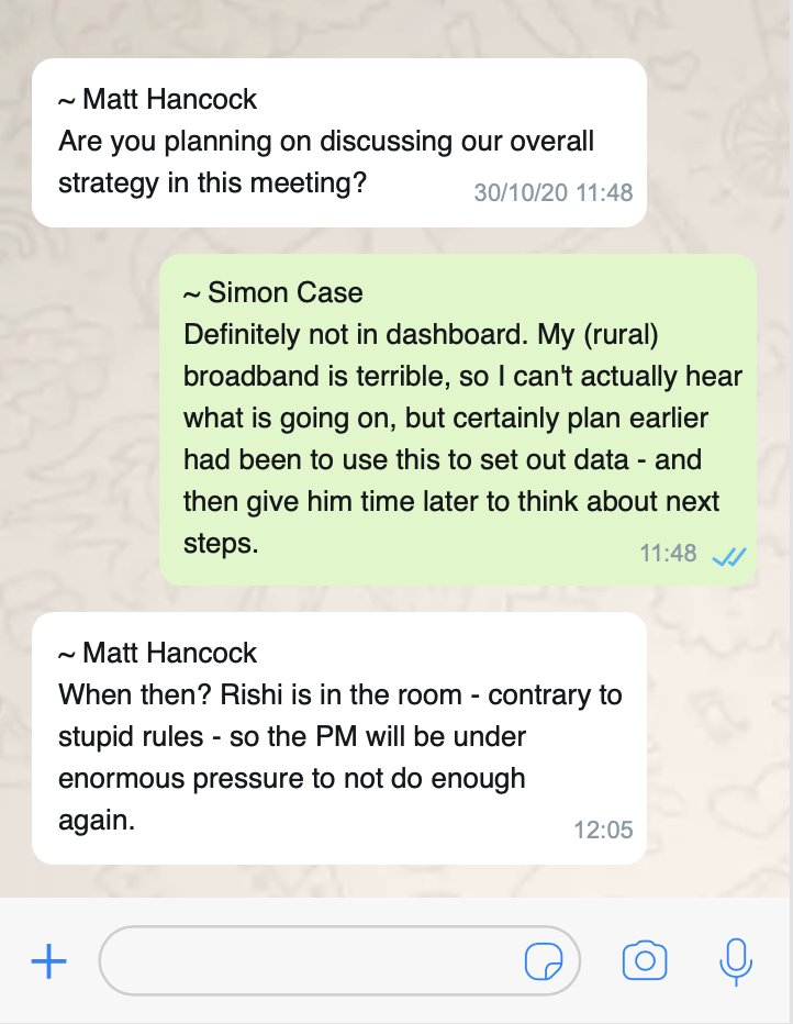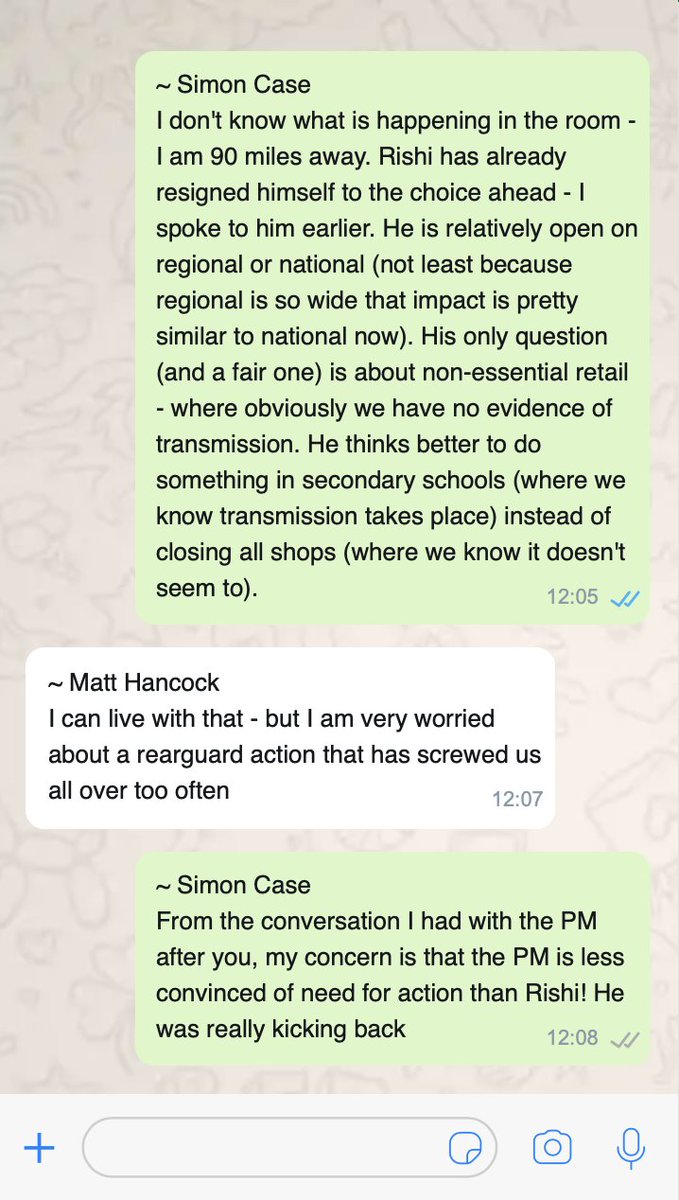There’s meeting later that day. In WhatsApps with Simon Case, Hancock appears worried Rishi Sunak will water down restrictions. “Rishi is in room… so PM will be under enormous pressure not to do enough once again” Case says PM “less convinced” than Sunak re: action (my graphic).
